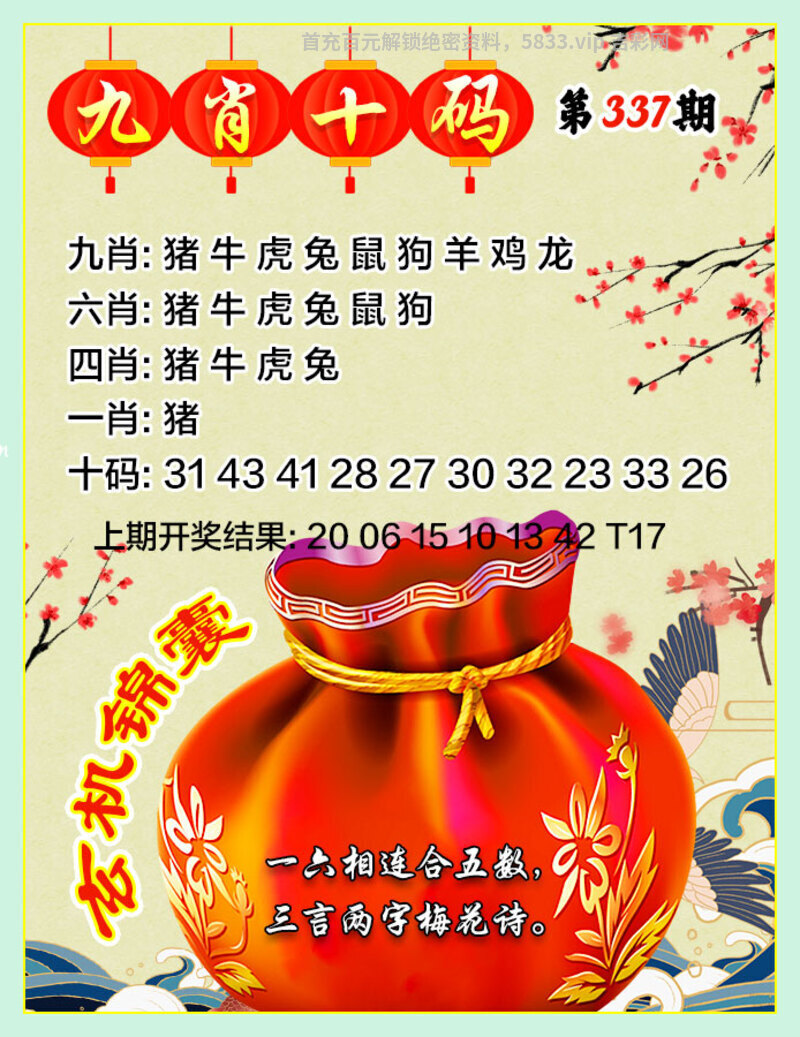 | 336期:九肖 | 羊兔牛虎鸡狗鼠猪猴 | 牛17中 |